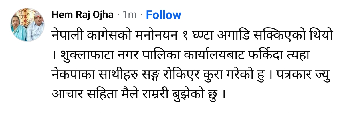 कृष्णपुर नगरपालिकाका मेयर हेमराज ओझाले नेपाली कांग्रेसको मनोनयन एक घण्टा पहिले सकेको र आफू शुक्लाफाटा नगरपालिका वार फकिदा नेकपाका साथीहरूलाई भेटेर आएको बताएका छन्।